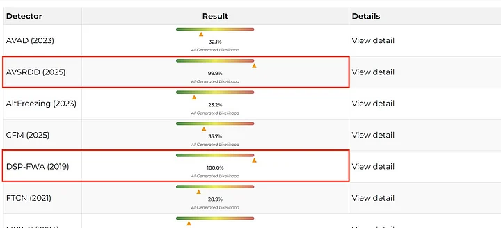 We also passed the video through several of DeepFake-O-Meter's detectors, three of which conclusively noted, with over 99 percent confidence, that the video is a deepfake.