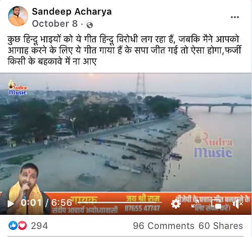 On 8 October, Acharya had also shared the video on his Facebook account with the caption: "कुछ हिन्दू भाइयों को ये गीत हिन्दू विरोधी लग रहा हैं, जबकि मैने आपको आगाह करने के लिए ये गीत गाया हैं के सपा जीत गई तो ऐसा होगा,फर्जी किसी के बहकावे में ना आए (sic)"