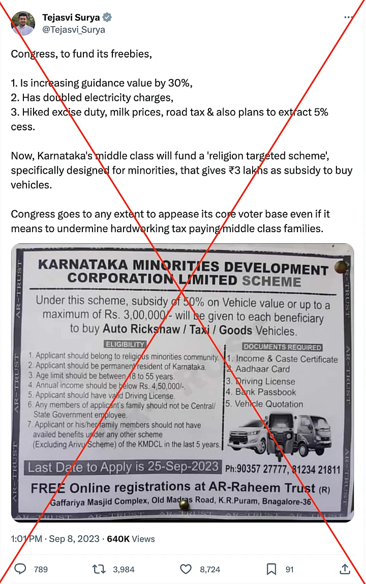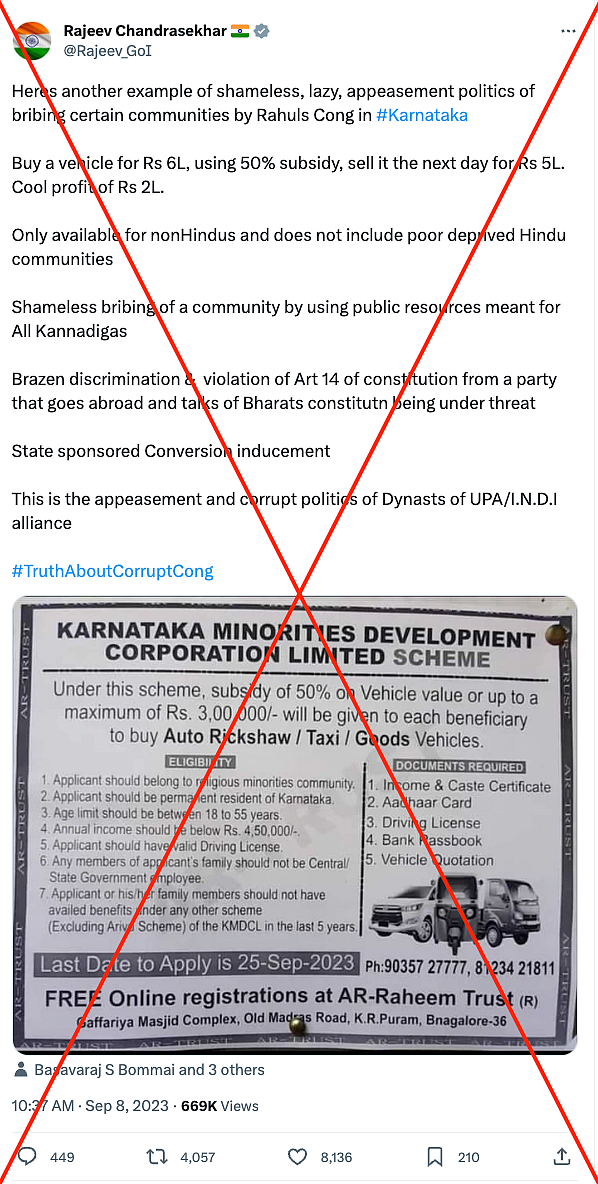 Conclusion: The Karnataka government's subsidy scheme for certain vehicles is applicable to all religious minorities in the state, not only for people from the Muslim community. Additionally, the former Bommai-led BJP government had a similar scheme.