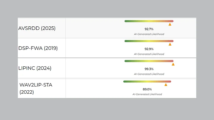 Four detectors of the second tool, too, showed conclusive results of the video being an AI one.