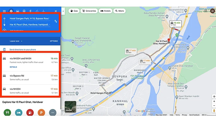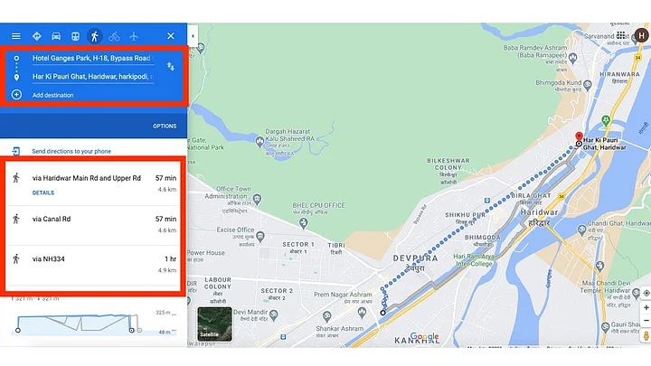 We looked up the hotel on Google Maps and found that it is indeed in Haridwar. Next, we searched for the distance between the said hotel and the Har ki Pauri Ghat where crowds gather for the holy dip.