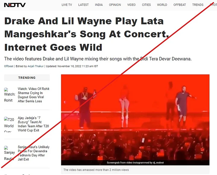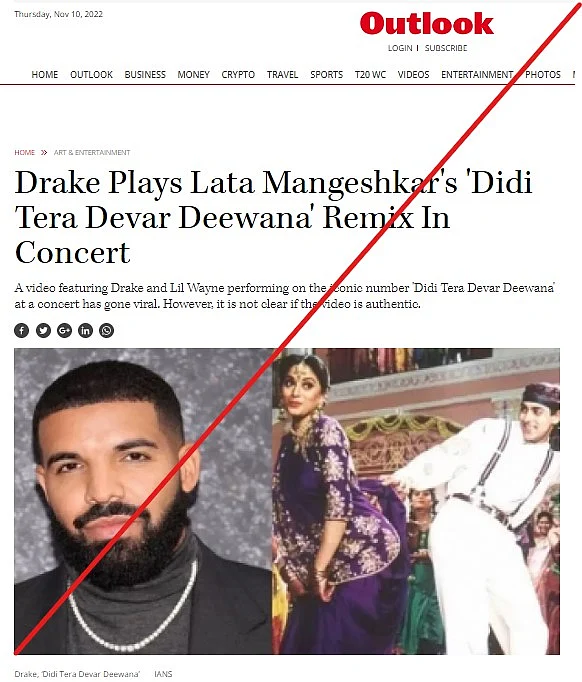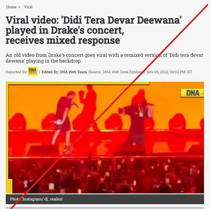 Several news media outlets like NDTV, Outlook, and DNA shared an edited clip showing Canadian singer and rapper Drake and rapper Lil Wayne performing to singer Lata Mangeshkar's song Didi Tera Dewar Deewana from the Bollywood movie Hum Aapke Hain Koun...! during their concert. The video was also erroneously shared by The Quint on its Instagram handle.