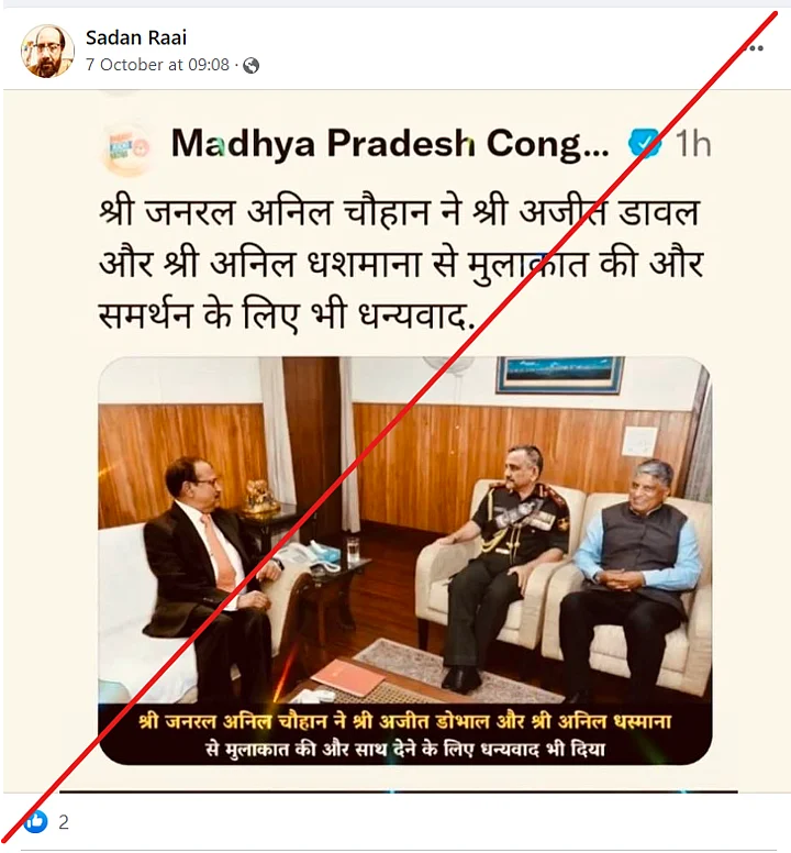 The photo is being shared with the caption that reads, "श्री जनरल अनिल चौहान ने श्री अजीत डावल और श्री अनिल धशमाना से मुलाकात की और समर्थन के लिए भी धन्यवाद"