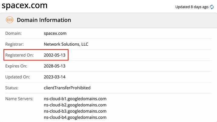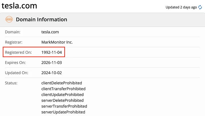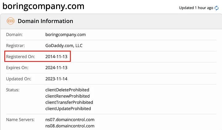 This is unusual for Musk-run companies, such as Tesla, SpaceX, X, and The Boring Company, whose domains were all registered in or before 2014 and in the United States of America.
