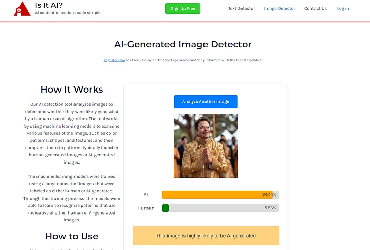 Passing the image through detection tools: We passed the image through two tools namely — 'Hive Moderation' and 'Is It AI?' and found that both of them showed a high probability of the viral image being an AI-generated one.