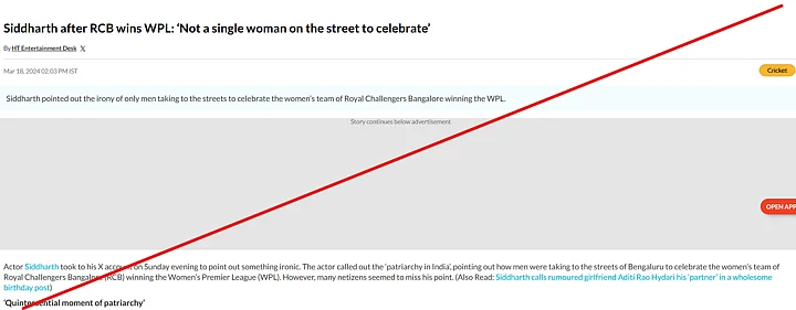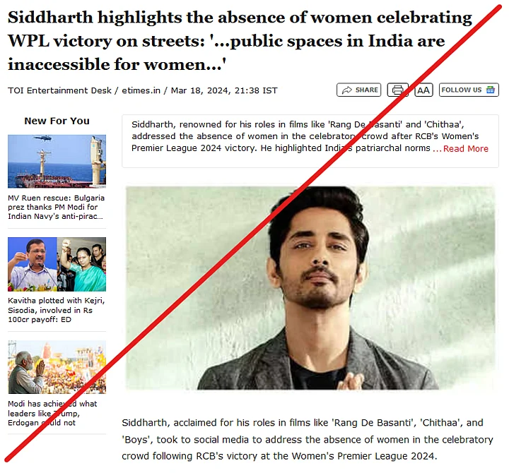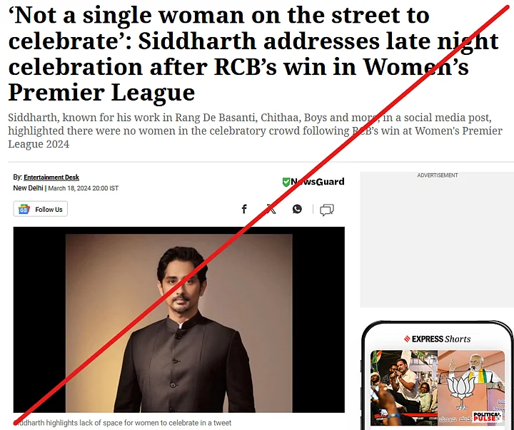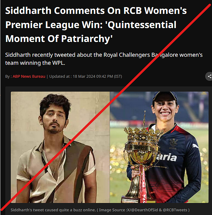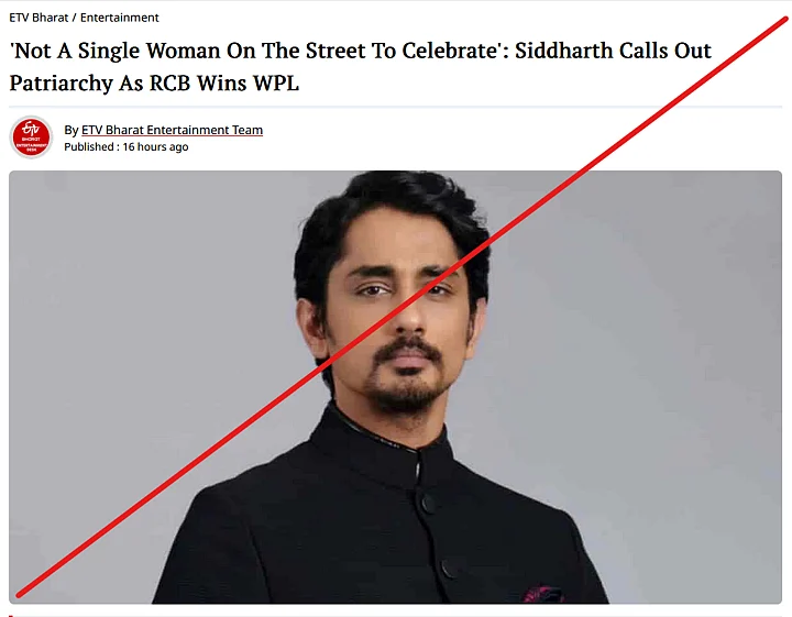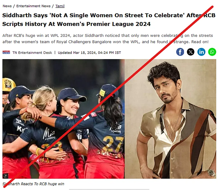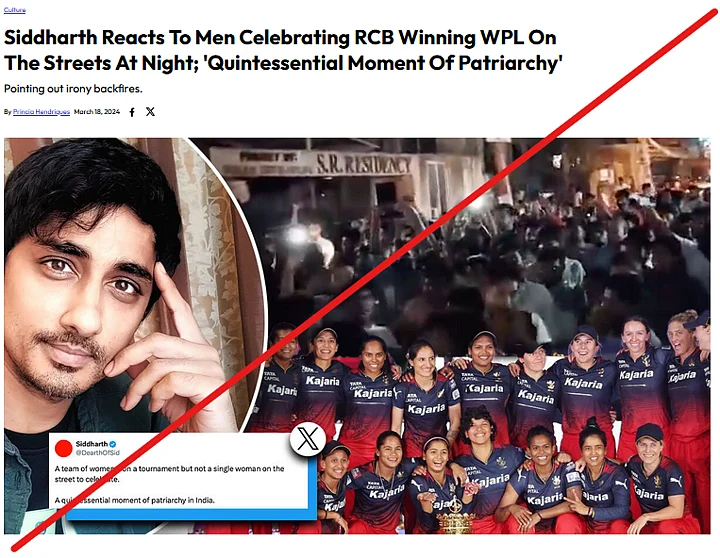 Several media outlets published reports about actor Siddharth allegedly criticising the absence of women on streets to celebrated Royal Challengers Bangalore's victory in TATA Women's Premier League (WPL).