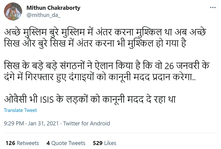 Another impersonator account of the Bollywood actor has gained traction in light of the West Bengal Assembly election. @MithunChakBJP, which earlier operated under the username @PMOIndiaArmy has over 9,000 followers.