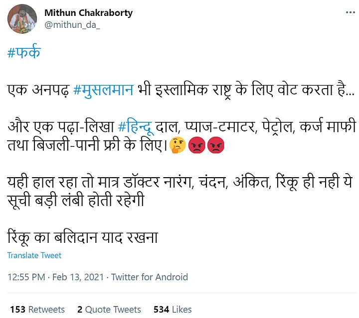 Another account that operates under the user ID @M_Chakraborty16, which had over 30,000 followers at the time of filing this story, is also impersonating Mithun Chakraborty to share anti-Muslim hate content and share unverified information.