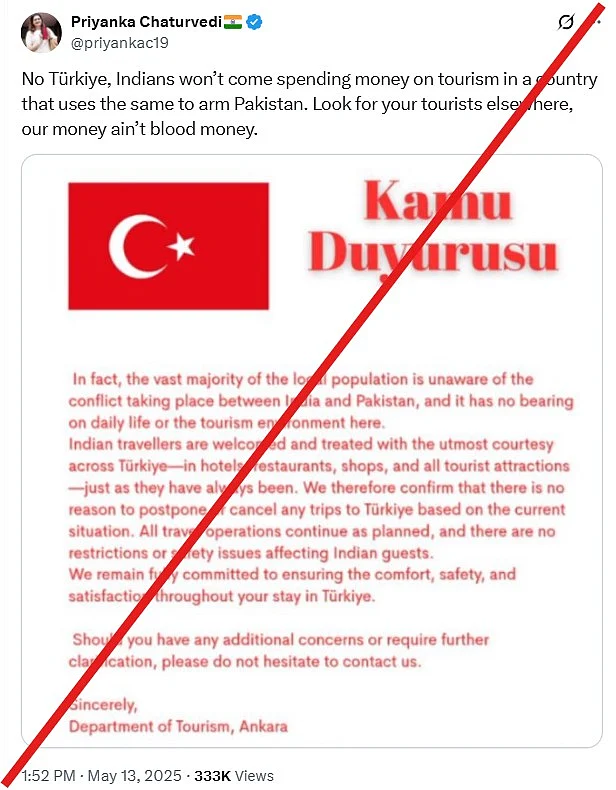 The letter also features the Turkish flag and the words “Kamu Duyurusu” (public notice or announcement), and reads, "A vast majority of the local population is unaware of the conflict taking place between India and Pakistan and it has no bearing on daily life or the tourism environment here. "