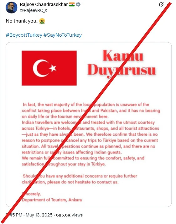 Conclusion: A fake letter is going viral on social media to claim that Turkey tourism ministry is urging Indians to 'not cancel their travel plans'.
