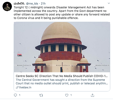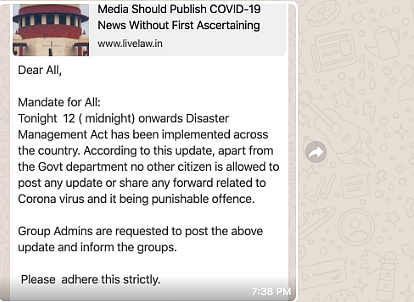 Some social media users are also circulating the viral message along with an article published in Live Law with the headline: “Centre Seeks SC Direction That No Media Should Publish COVID-19 News Without First Ascertaining Facts With Govt.”