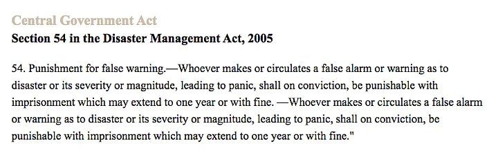 Section 54 in the Disaster Management Act makes it a punishable offence to circulate a false alarm or warning about a disaster or its severity or magnitude.