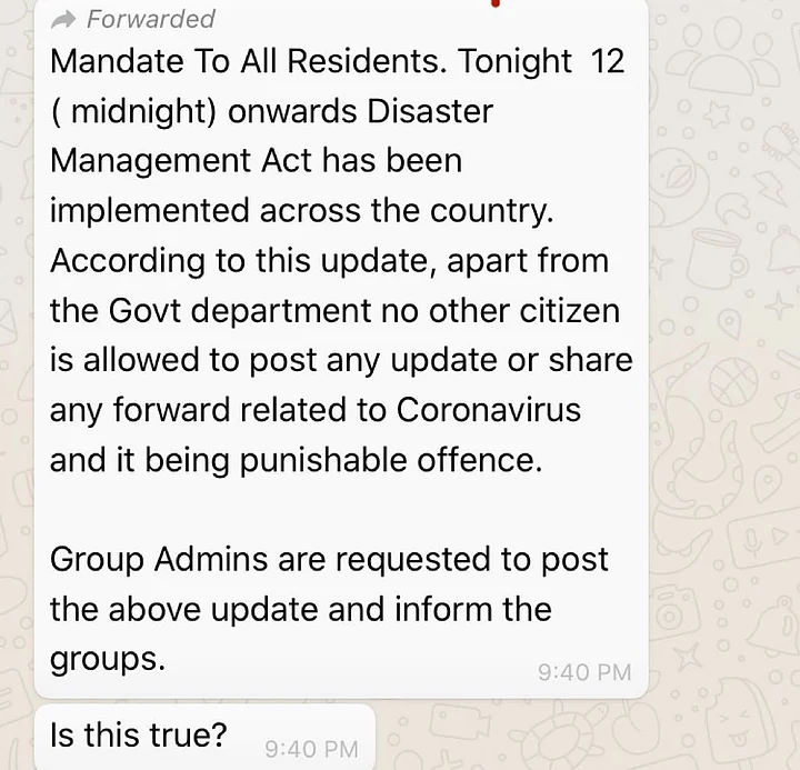 The message reads, "Mandate To All Residents. Tonight 12 ( midnight) onwards Disaster Management Act has been implemented across the country. According to this update, apart from the Govt department no other citizen is allowed to post any update or share any forward related to Coronavirus and it being punishable offence. Group Admins are requested to post the above update and inform the groups. (sic)"