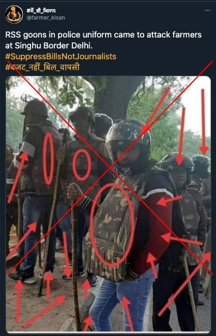 An image of a person in police protective gear over civilian clothes is being shared with a claim that he is affiliated with the Rashtriya Swayamsevak Sangh (RSS) and was involved in the attack on farmers at the Singhu border.