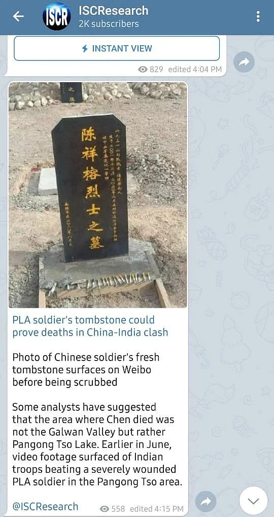For example, early in September, several news channels broadcast visuals from a cemetery in China to claim that it shows the graves of the Chinese troops killed in the Galwan valley face-off. In this report, The Quint illustrated how these claims are false and the visuals which were aired date back to 2011 and 2019. We found that these visuals were shared by the admin on the ISC Research group with a similar misleading claim.