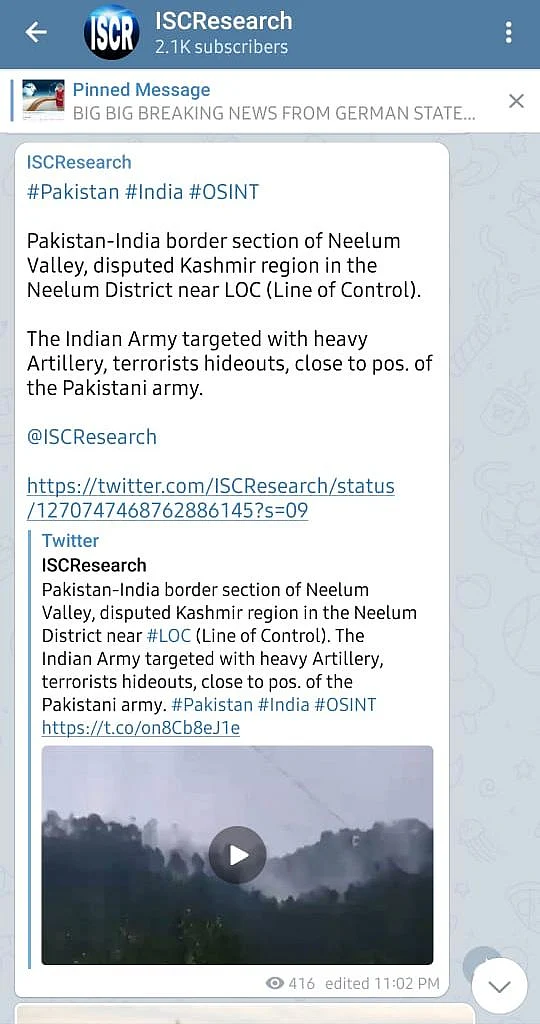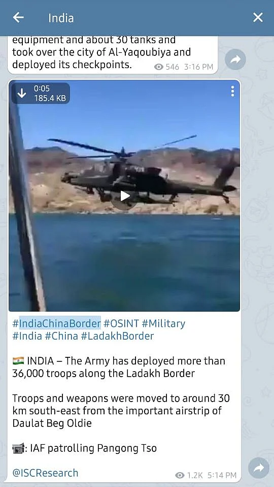 As the situation between India and China remains tense along the Line of Actual Control (LAC), we observed that multiple groups claiming to be managed by ‘Open Source Intelligence (OSINT) experts’ are broadcasting misleading information to their subscribers. We analysed the content posted by one such group called ‘ISC Research’ and found out that information which has already been debunked by fact-checkers was rampant in this group.