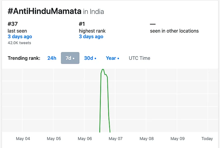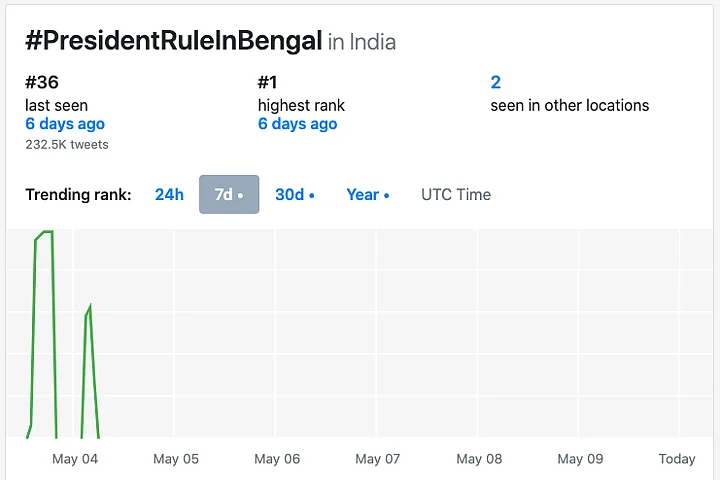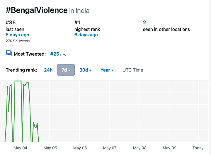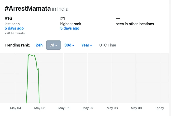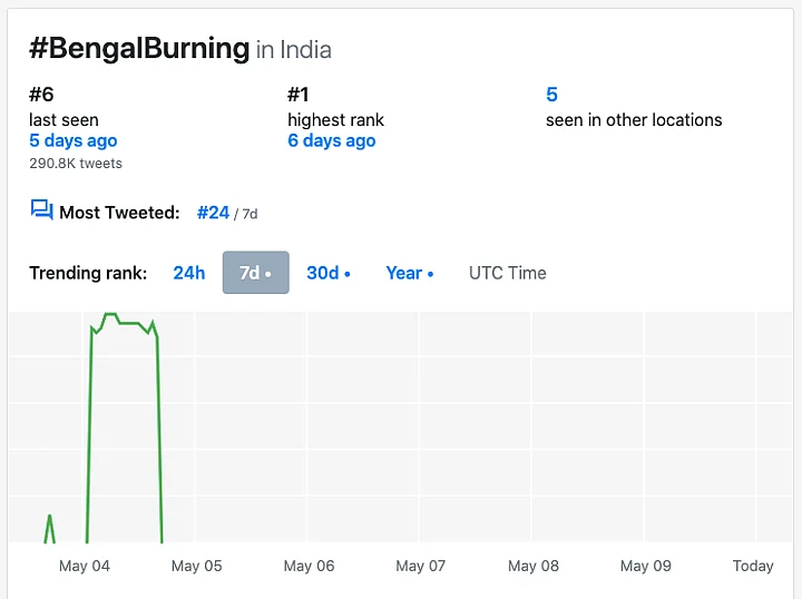 Amid this, hashtags like #BengalViolence, #BengalBurning #PresidentRuleInBengal, #AntiHinduMamata and #ArrestMamata started gaining traction on Twitter. As many as 290.8k tweets were made using the hashtag ‘Bengal Burning’, 220.4k using ‘Arrest Mamata’, 232.5k using the hashtag ‘PresidentRuleInBengal’ on 4 May, alone.