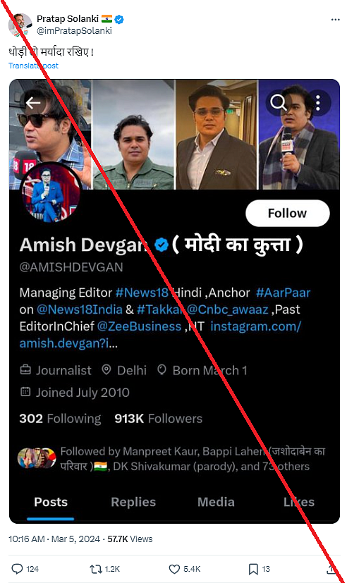 A different image is going viral with a claim that News18's Amish Devgan has added "Modi's lapdog" on his official X handle.