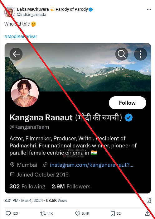 Similarly, a screenshot of Bollywood actor Kangana Ranaut's X handle which showed the words "मोदी की चमची" (Modi's sycophant) written next to her name is doing the rounds on social media platforms.