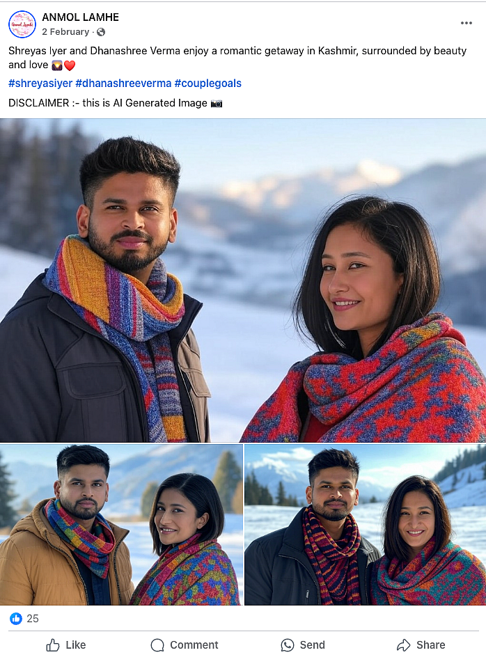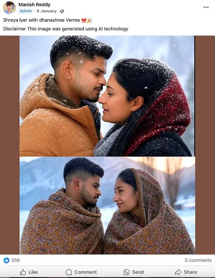 While we debunked a specific set of images, we found over 20 AI-generated visuals of Iyer and Verma between January and February. All these posts insinuated that the two were “finally” together following Verma and Chahal’s alleged divorce.