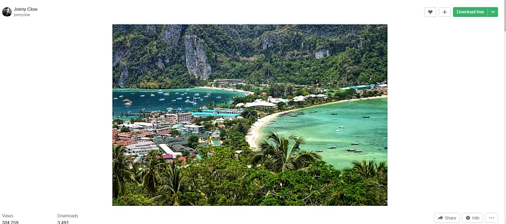 Its caption said, "Tonsai Beach bay view with many traditional longtail boats parking and palm seafront in Thailand, Phi Phi island, Krabi Province, Andaman Sea."