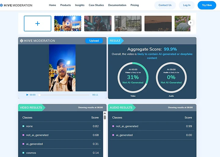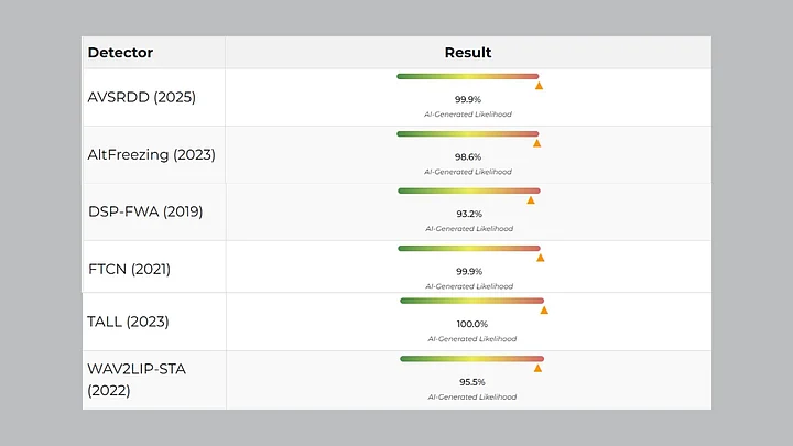 Six detectors of the second tool gave conclusively results showing that the video was indeed an AI one.