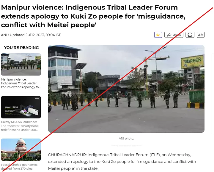Indian news agency Asian News International (ANI) and news outlets The Times of India and India Today North East published a report based on a viral letter to claim that the Indigenous Tribal Leader Forum (ITLF), a conglomerate of several tribal groups in Manipur, extended an apology to the Kuki-Zo community.