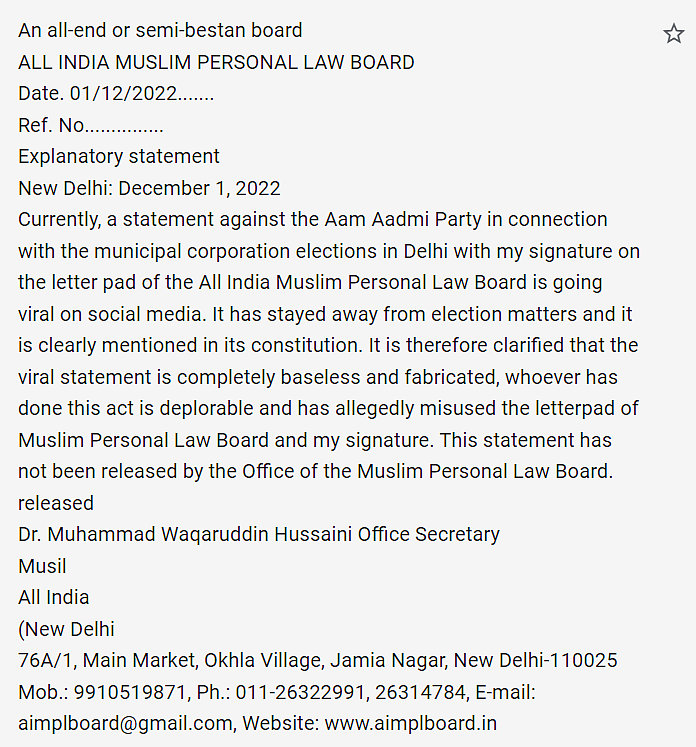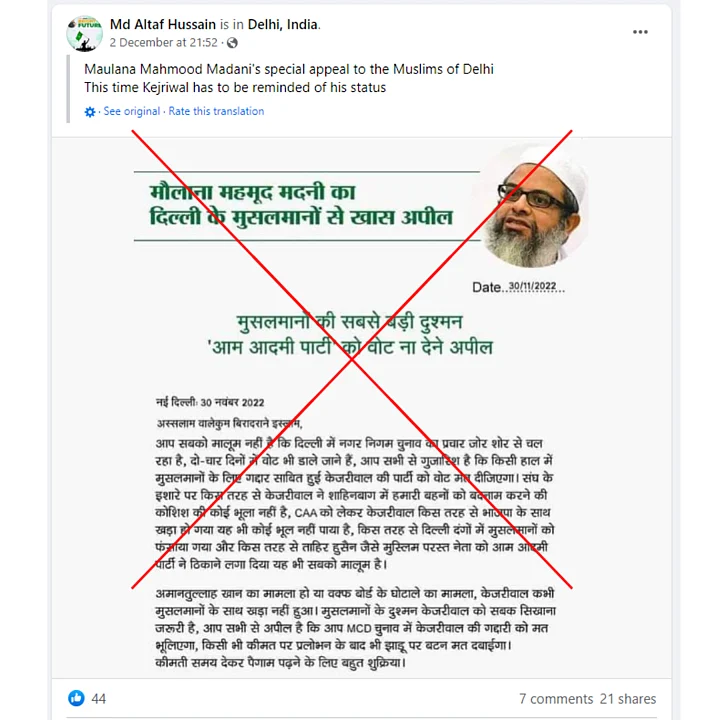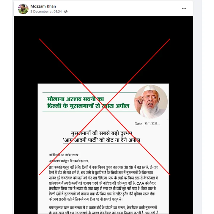 A purported letter, attributed to Tablighi Jamaat leader Maulana Saad, is being shared on social media with a claim that he asked Muslims to not vote for the Aam Aadmi Party (AAP) in the 2022 Delhi MCD Elections, which were held on Sunday, 4 December.