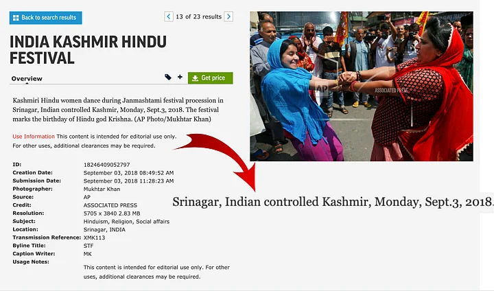 Next, we came across an image uploaded on Getty images that was captured in August 2013 and mentioned that it showed Kashmiri Hindu devotees dance during Janmashtami celebrations in Srinagar.