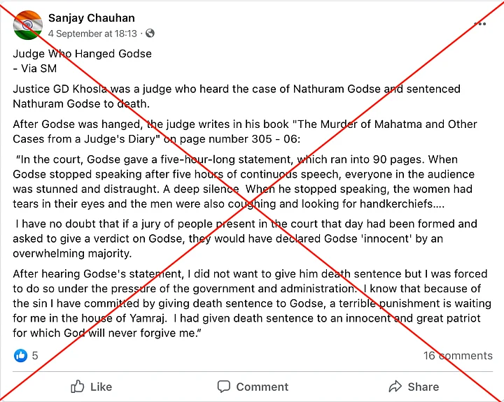 Social media users are sharing a post related to the death sentence given to Nathuram Godse, the man who assassinated Mahatma Gandhi, by then-Chief Justice of Punjab High Court, Justice GD Khosla, who presided over the case.