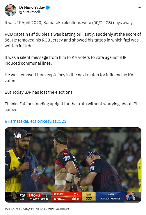 On the day of the results, 13 May, a Twitter Blue subscriber named "Dr Nimo Yadav" shared a post on his account. It talked about an Instagram story purportedly uploaded by cricketer Virat Kohli in support of Congress leader Rahul Gandhi.