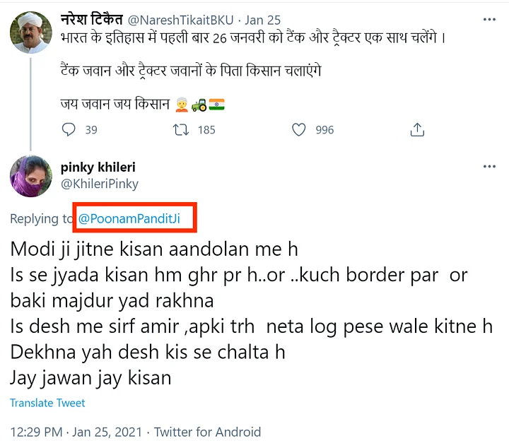 However, a reverse image search of the profile picture led us to another Twitter account (@KisaanPunam), who claims to be a BKU spokesperson and has a Facebook page, ‘Poonam Pandit Shooter’.
