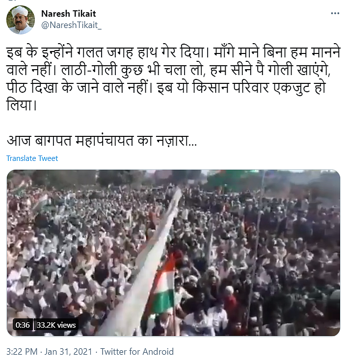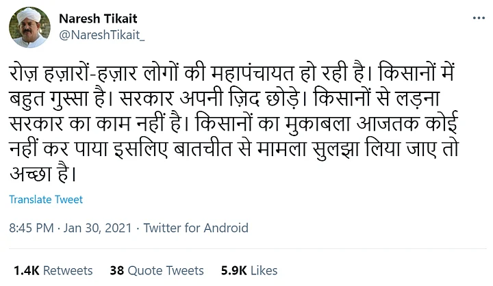Following which, a Twitter account (@NareshTikaitBKU), claiming to be a BKU leader and Rakesh Tikait’s brother, Naresh Tikait, thanked Delhi Chief Minister Arvind Kejriwal for providing basic facilities at the Ghazipur site.
