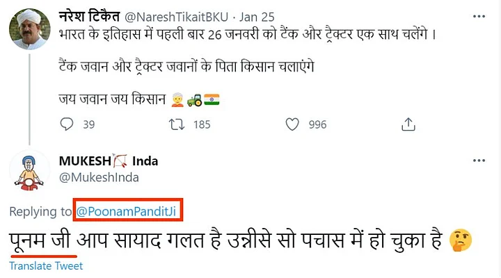Going through the responses on the account, we found that it existed with another username (@poonampanditji). In fact, several users have also referred to the user as ‘Poonam’ in their replies.