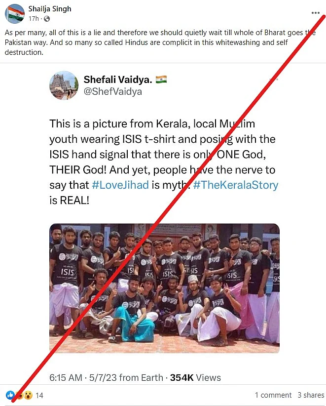A screenshot of a tweet attributed to author and right-wing commentator Shefali Vaidya is going viral on social media which shows a picture of group of Muslim men wearing t-shirts with 'ISIS' written over them.