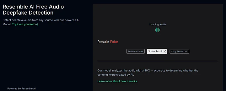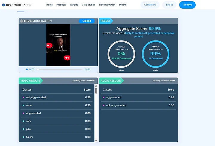 To further verify the authenticity of the clip, we passed it through two detection tools named 'Hive Moderation' and 'Resemble AI'.