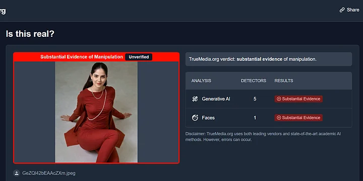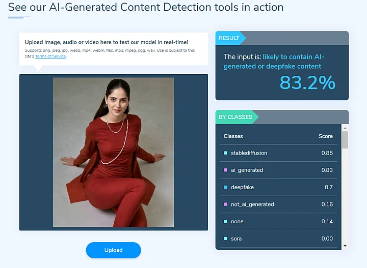 डिटेक्शन टूल्सने काय दर्शविले?: टीम वेबकूफने ट्रूमीडिया आणि हायव्ह मॉडरेशन या दोन एआय डिटेक्शन टूल्सद्वारे व्हायरल इमेज पास केली. या दोघांनीही ही प्रतिमा एआय-जनरेट असल्याचे ठोस पुरावे दाखवले.