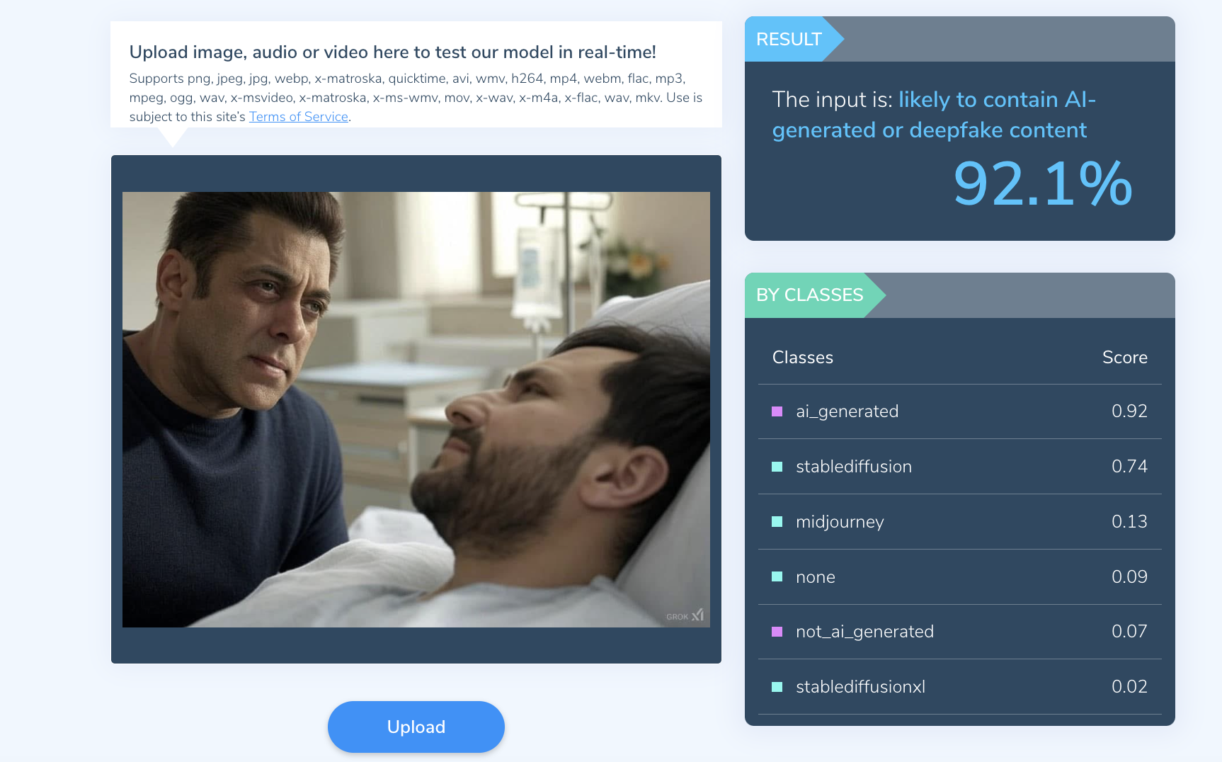 त्यानंतर आम्ही हायव्ह मॉडरेशन आणि साइटइंजिन सारख्या एआय-डिटेक्शन वेबसाइट्सवर ही प्रतिमा चालवली. निकाल खालीलप्रमाणे आहेत: