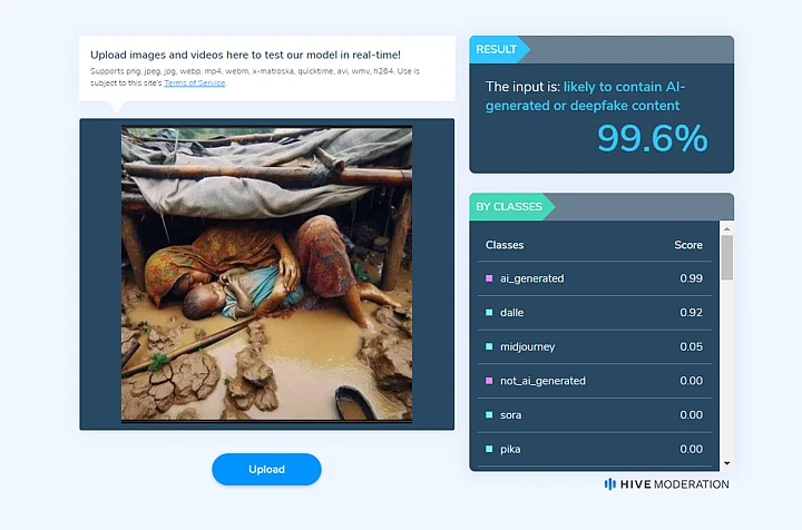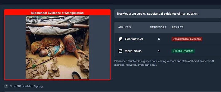 We then passed the image through two AI detection tools namely 'TrueMedia' and 'HiveModeration'. Both tools showed that the picture was indeed generated using the help of AI.