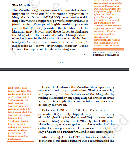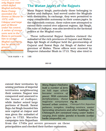 The Marathas and Rajputs find mention in the 10th chapter of the book Class VII book called "Our Past-II". In this chapter, those dynasties that helped in shrinking the Mughal Empire or created problems for them find a mention.