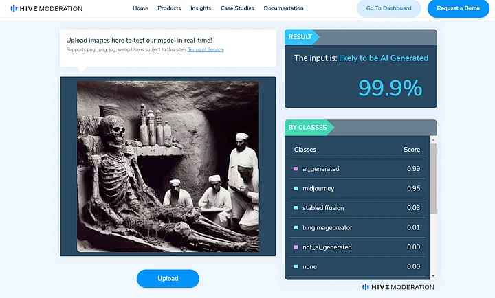 Passing the images through detection tools: Using the help of a detection tool named 'Hive Moderation', we checked the authenticity of the viral images.