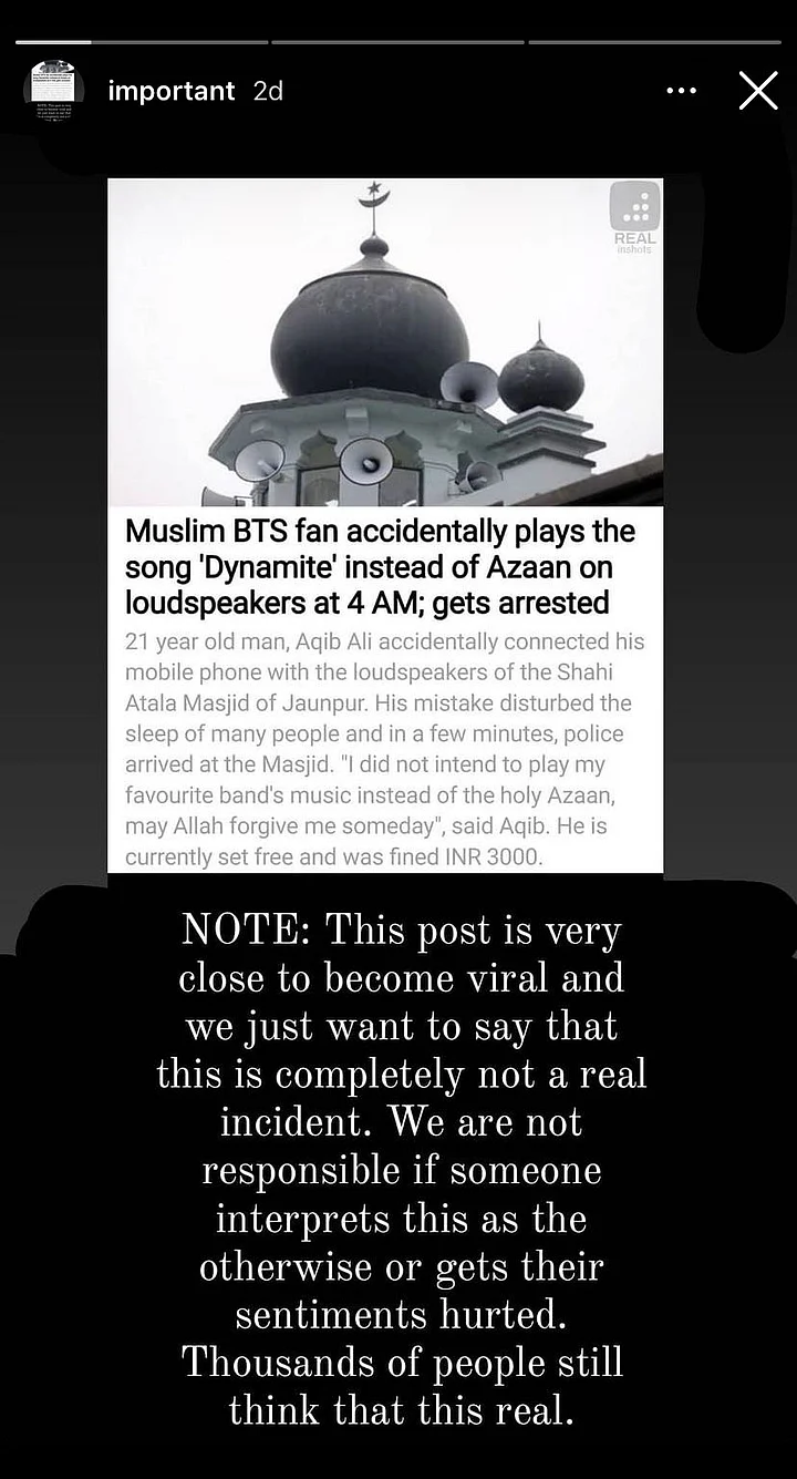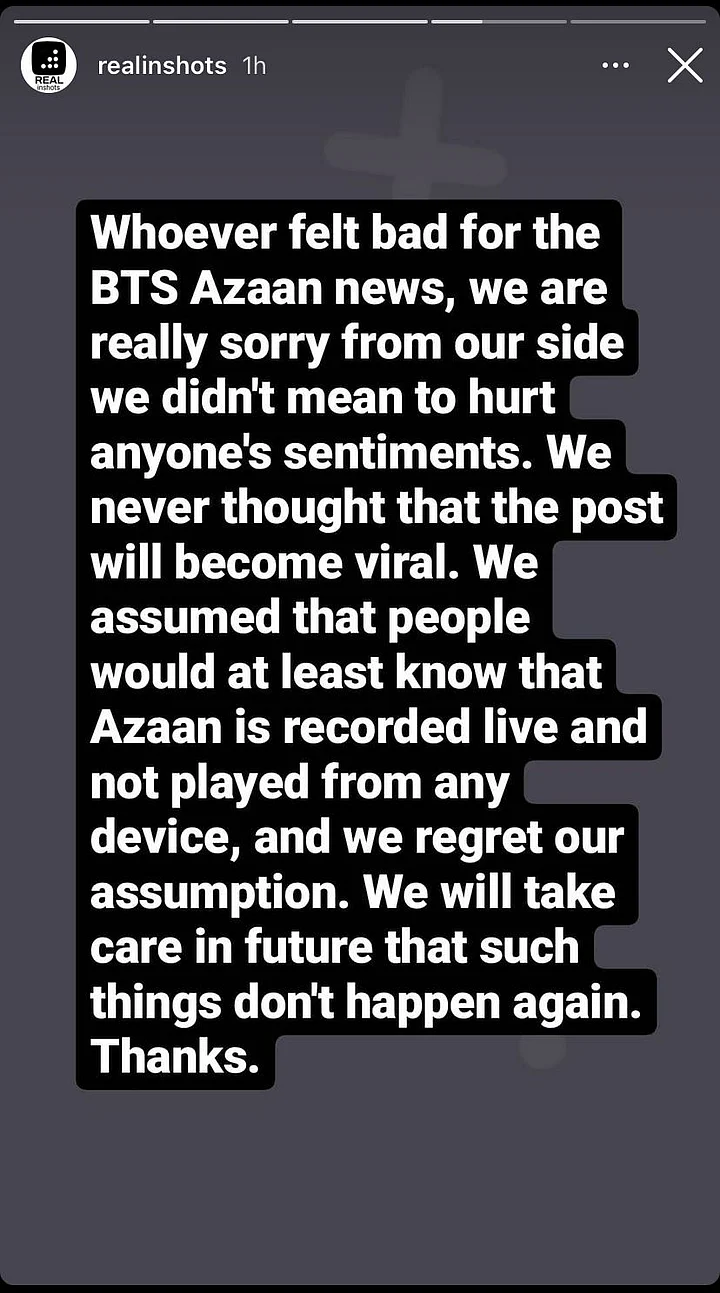 Since then the account has clarified that the incident is not real. They have put up two Instagram stories stating the same that they bear "no responsibility" if somebody interprets their posts in any other way. The account has also apologised for hurting religious sentiments and making assumptions regarding the morning call to prayer, or Azaan, in mosques.