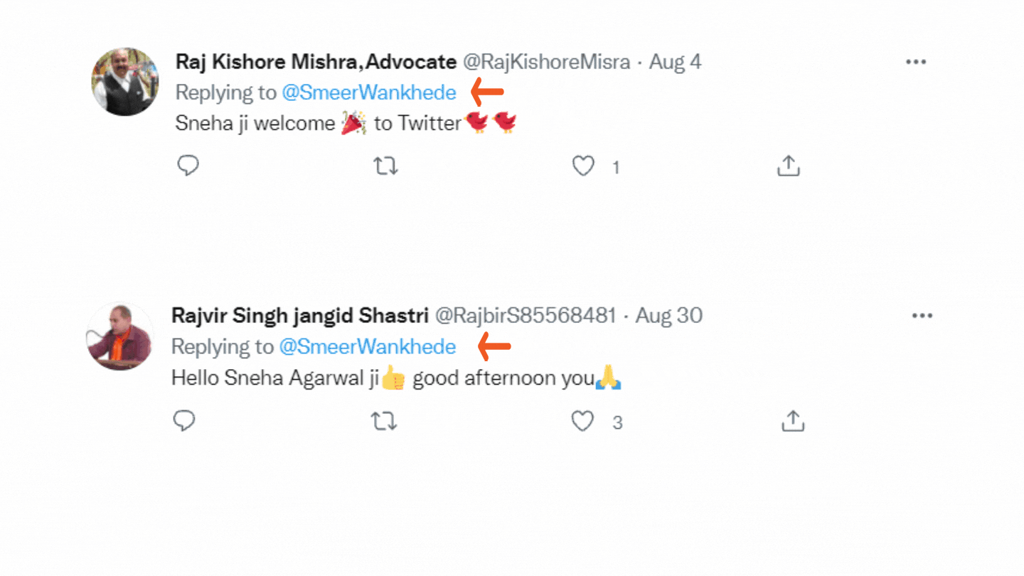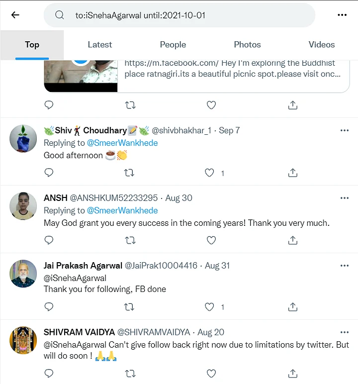 Taking a cue from the comment, we conducted a Twitter advanced search of the handle "iSnehaAgarwal" for tweets posted before 1 October and the result showed the replies to present account in the name of Wankhede, "@SmeerWankhede".