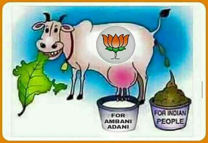 In one particular version of the cartoon, the cow (depicted as the Congress party) is seen eating an India-shaped leaf and defecating into a bucket (Indian people) while the milk it produces is collected in a separate bucket (the Gandhi family).