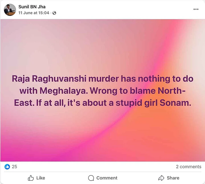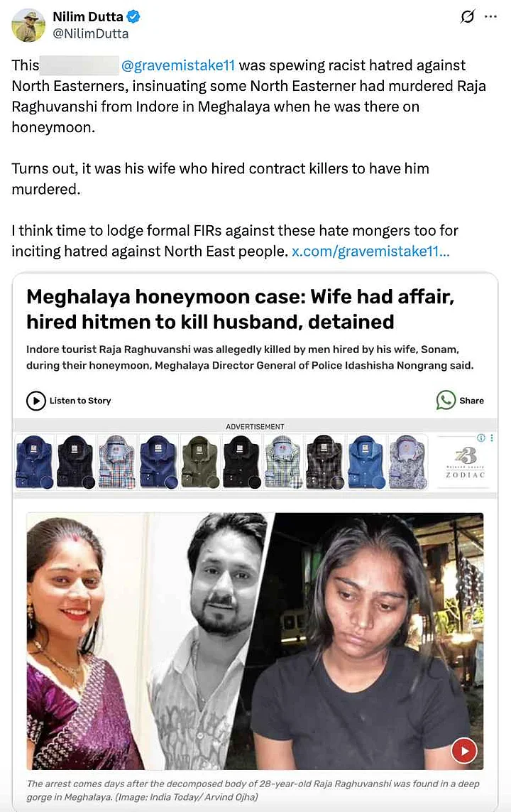 Once it was revealed that the murder was allegedly planned by Raghuvanshi's spouse, several social media handles noted that it was wrong to blame the region. These users demanded an apology for the racist comments against the communities.