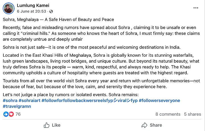They pointed out that Sohra was not 'unsafe,' as claimed by several people and that the region must not be judged by an isolated incident.