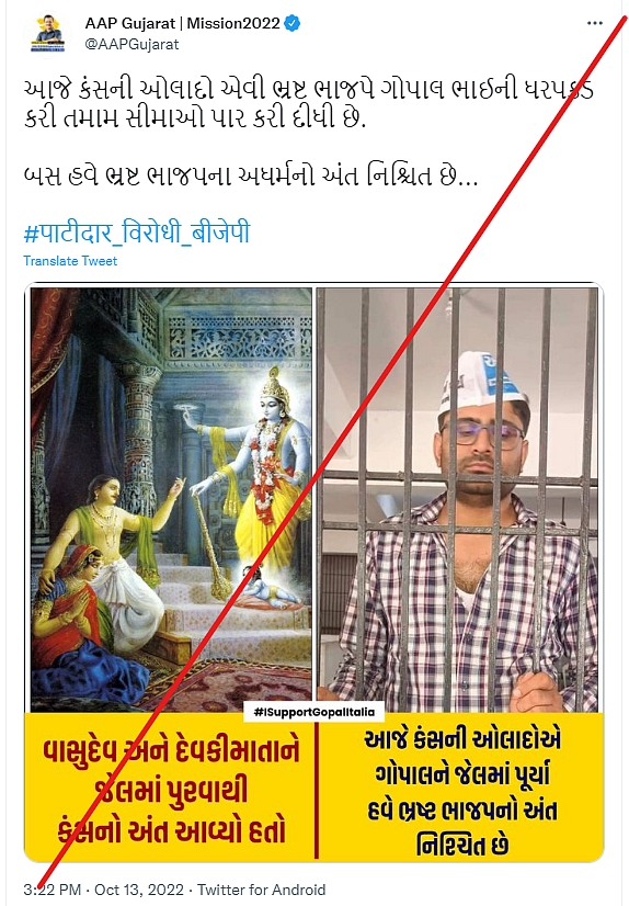 Several Aam Aadmi Party's (AAP) leaders and some of the party's official accounts have shared an image showing the party's Gujarat chief, Gopal Italia, standing behind bars with messages of support for the leader, claiming that he was "arrested" by the Delhi Police on Thursday, 13 October.