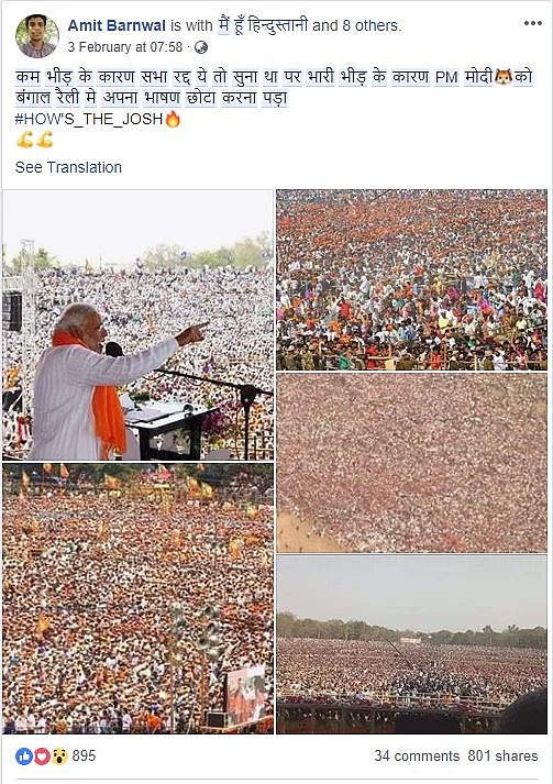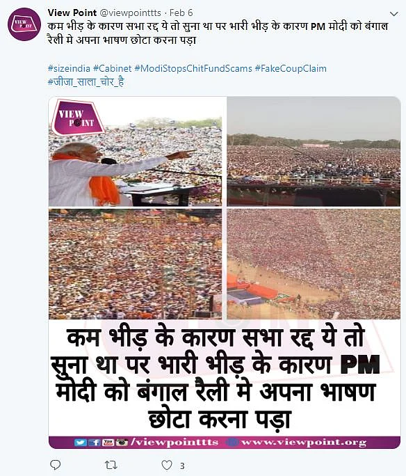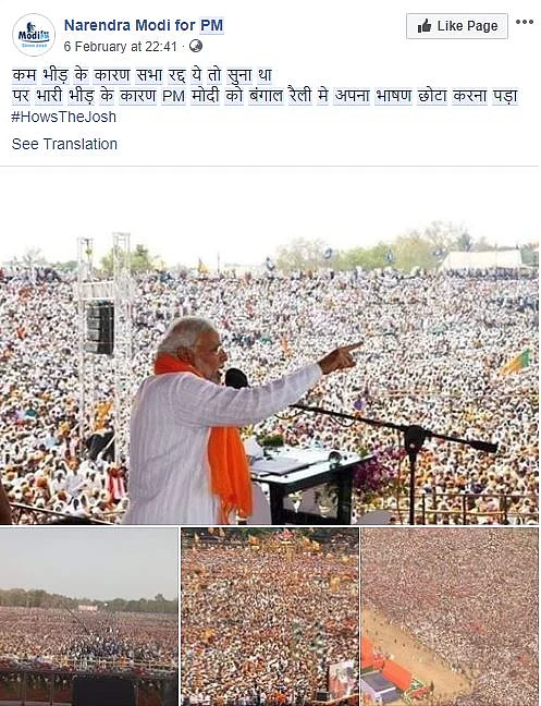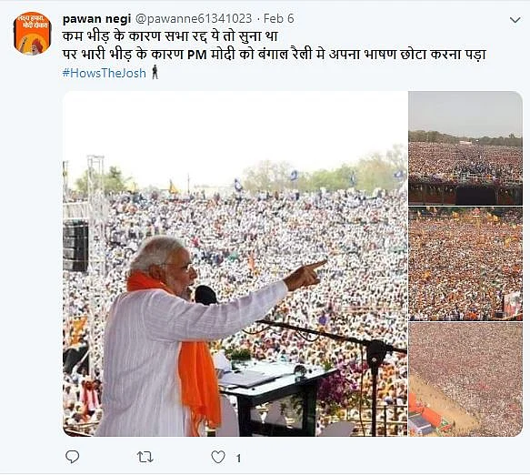 “कम भीड़ के कारण सभा रद्द ये तो सुना था पर भारी भीड़ के कारण PM मोदी को बंगाल रैली मे अपना भाषण छोटा करना पड़ा” - that’s the caption that has gone viral on social media along with a set of photos.