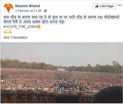 The caption roughly translates to: “We have all heard about rallies getting cancelled due to low attendance but PM Modi had to curtail his speech in Bengal due to excessive audience”.