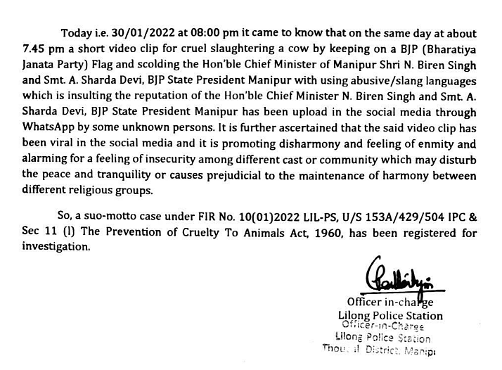 The Imphal Times, The Hindu and The Times of India have stated that police registered a case after a video of the three people slaughtering a cow over the BJP flag went viral in January 2022.